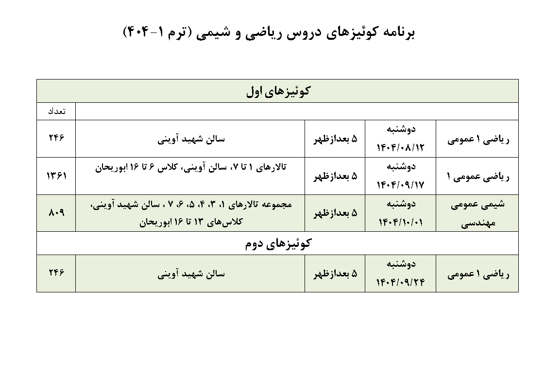 برنامه امتحانات ميانترم و كوئيزهاي دروس پرجمعيت شيمي و رياضي ترم 1-404 همراه با محل هاي اختصاص يافته: