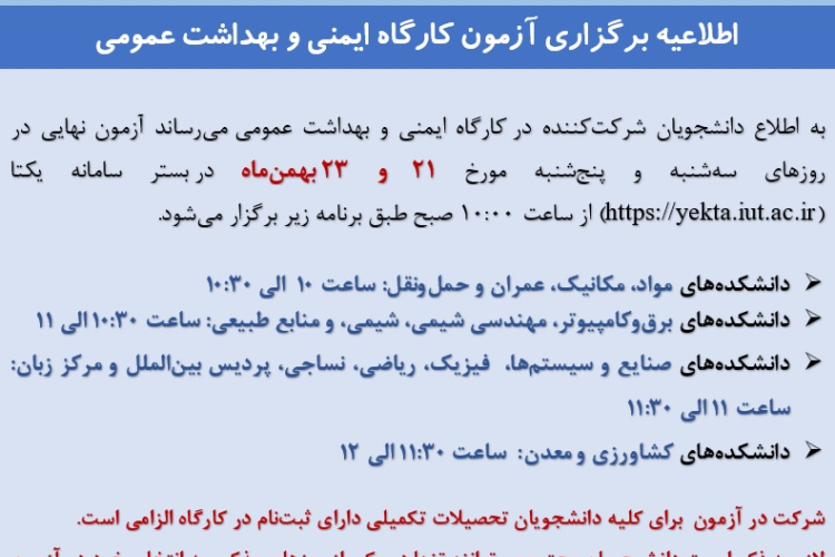 اطلاعیه برگزاری امتحان مجدد امتحان آنلاین نهمین دوره کارگاه های ایمنی و بهداشت عمومی