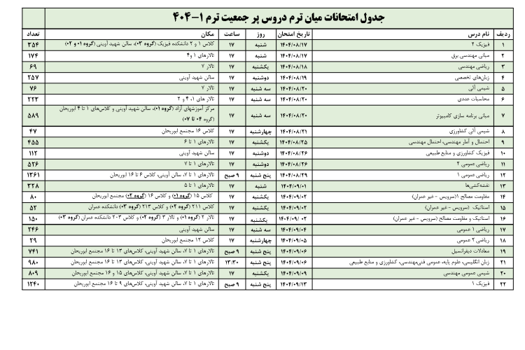 جدول امتحانات ميانترم و كوئيزهاي دروس پرجمعيت 1-404