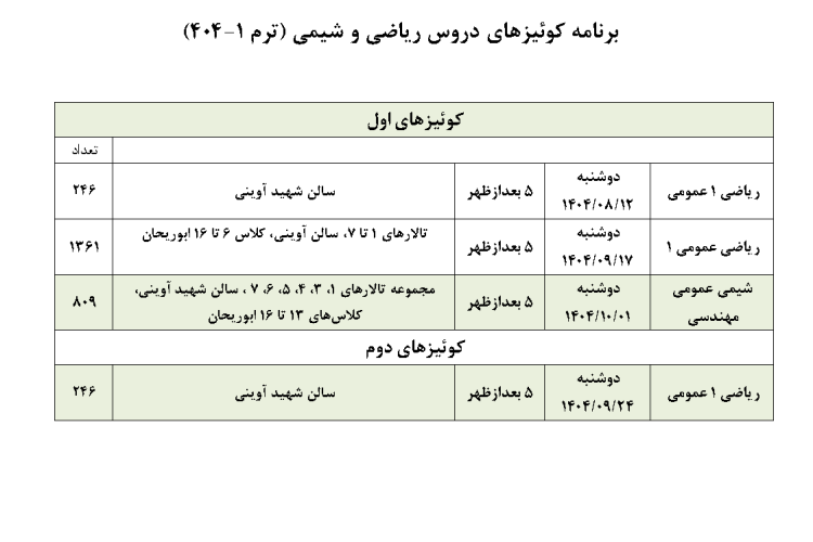 برنامه کوییزهای دروس ریاضی، فیزیک و شیمی ترم 1-403